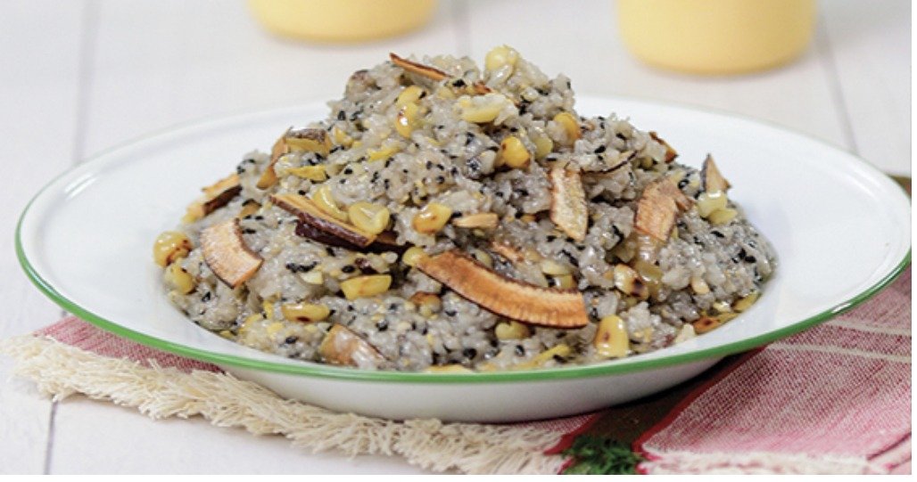 Savoury sticky rice with sesame seeds, crushed peanuts, sliced coconut in fragrant ginger oil